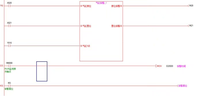 LD X0 意味着当外部触发信号 X0 到来时,气缸控制程序开始工作。SET M100 使气缸伸出,RST M102 用于气缸缩回。这样简单的逻辑通过 FB 块封装起来,让气缸控制变得简洁明了。