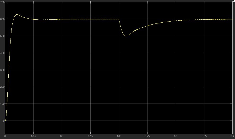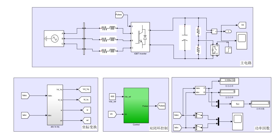 在仿真中,我们搭建三相电压型PWM整流器模型,设置好双闭环PI控制参数。设定输出电压为600V,且运行在单位功率因数状态下。