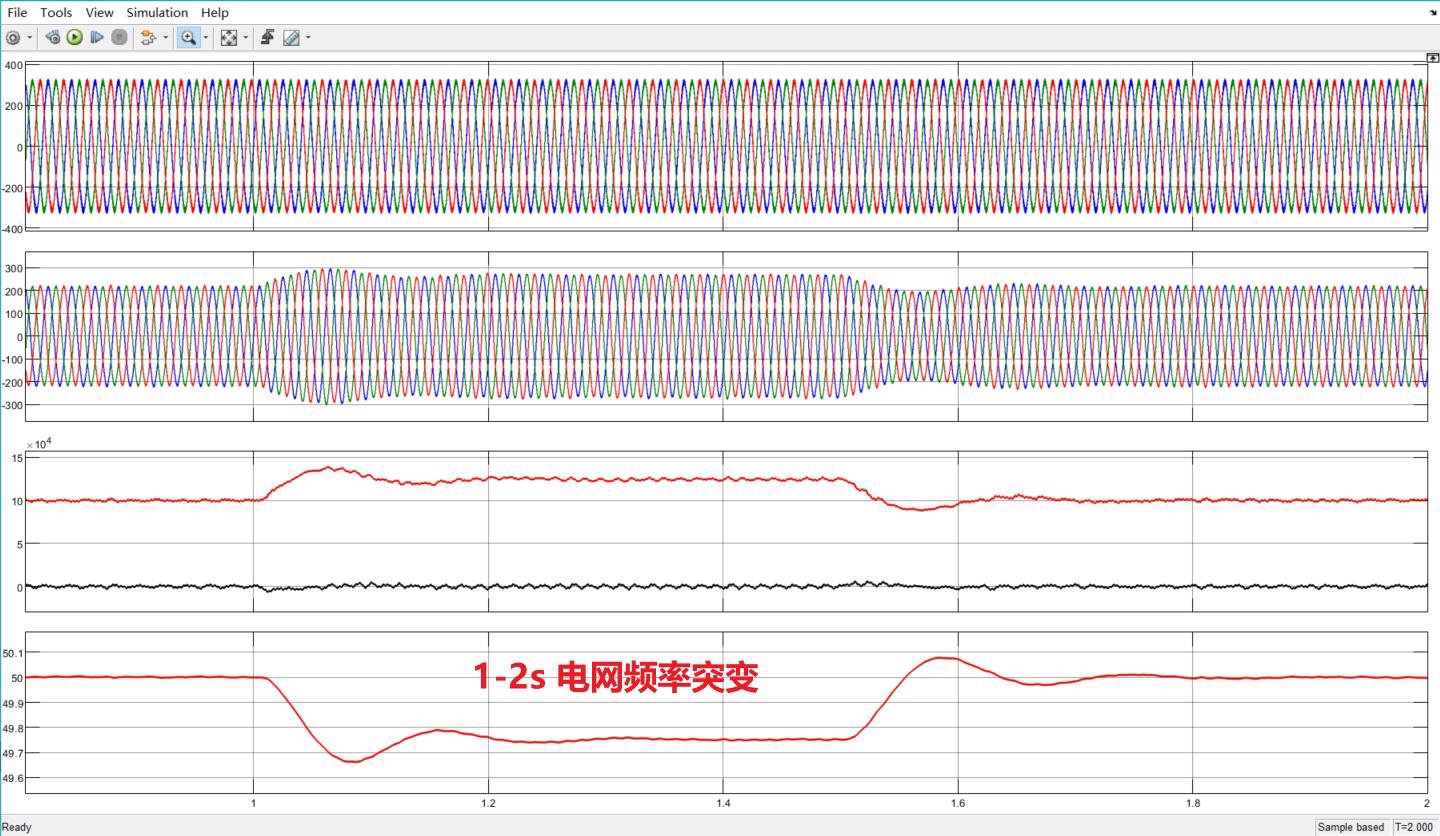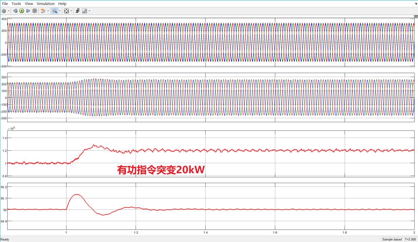 建完模型跑个仿真(图2),重点观察两个场景:①电网频率突然从50Hz跌到49.8Hz时,VSG在200ms内自主增加了5%的有功输出;②本地负荷突增20%时,系统电压先跌后恢复,整个过程呈现典型的二阶系统响应特性,这得益于虚拟转子带来的惯性支撑。