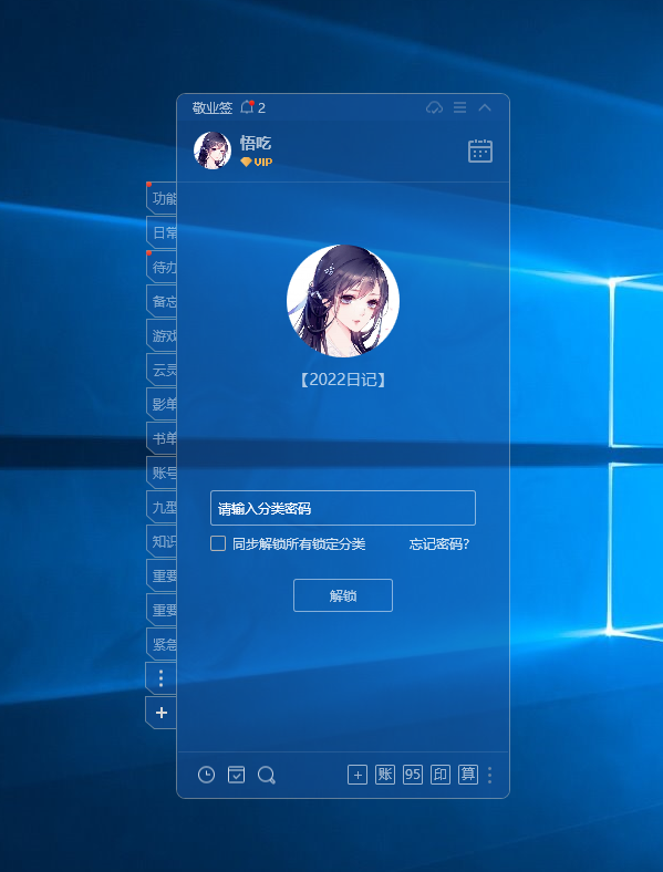 隐私加密功能也非常好用,可以设置锁屏、锁分类两种方式,给日记内容加密。用户可以点击自己的头像进入系统设置,在个人设置一栏设置锁屏密码和锁分类密码,然后点击敬业签主页面右上角“三”>锁定敬业签,将敬业签锁屏,还可以在记录日记的分类上,右键单击分类标签,在编辑分类标签,勾选“开启密码锁定”,将日记分类锁定。锁屏之后之后输入密码才能解锁。