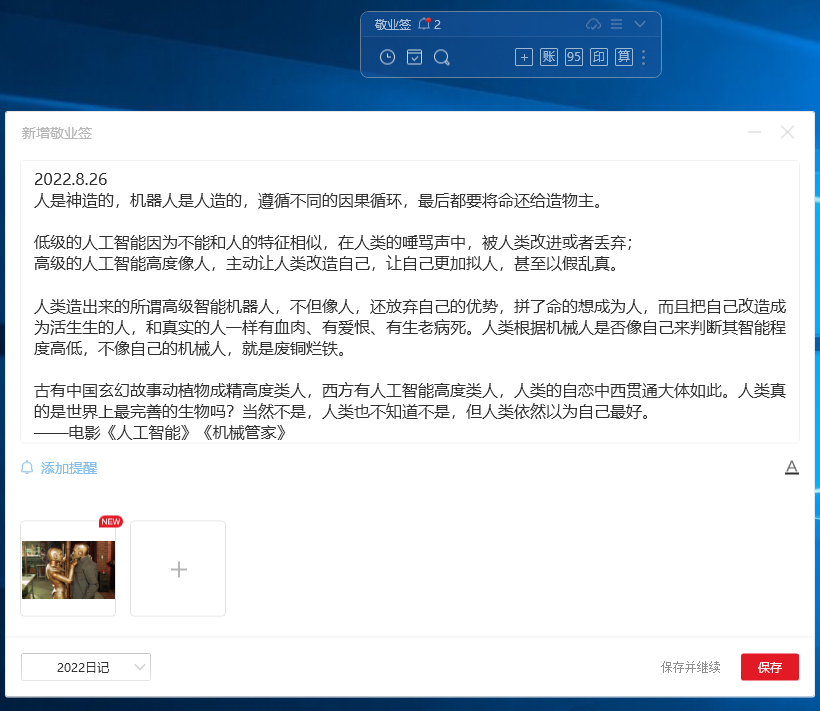 本文介绍了一种在电脑上高效撰写日记的方法,推荐使用敬业签软件。通过该软件,用户可以方便地输入文本、添加图片等多种类型的内容,并提供了隐私加密功能确保日记的安全。