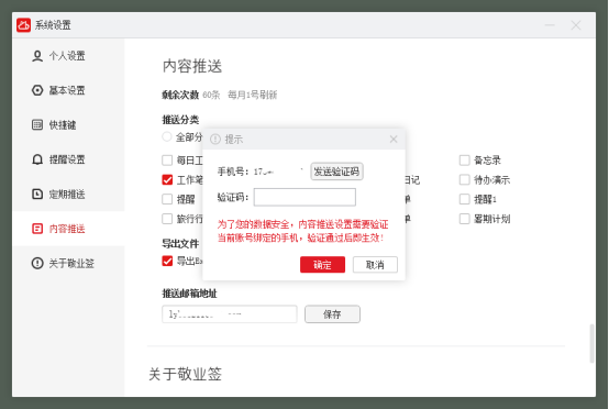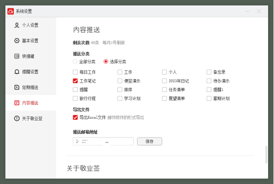 文章介绍了在敬业签这款电脑笔记软件中,用户可以如何将分类记录的笔记导出为Excel格式,并通过邮箱发送。步骤包括进入系统设置,选择内容推送,设定分类,验证手机号,最后接收推送邮件。