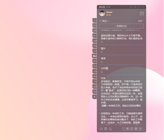 现在,我已经离不开透明记事本了。它不仅是我工作中的得力助手,更是我生活中的贴心小秘书。有了它,我再也不用担心记事本会干扰我的视线或影响我的工作效率了。而且它还有拥有丰富的记录形式,以及准时的提醒功能、多端同步功能,非常高效便捷。