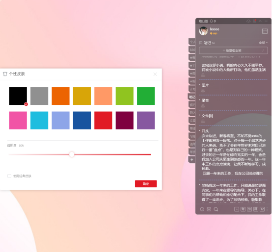 设置记事本的透明度非常简单。只需要点击窗口顶部的设置按钮,在个性皮肤选项中,找到透明度调节条,轻轻拖动就能实时预览透明度效果。找到最适合自己的透明度后,点击保存即可。整个过程轻松愉快,让我爱不释手。