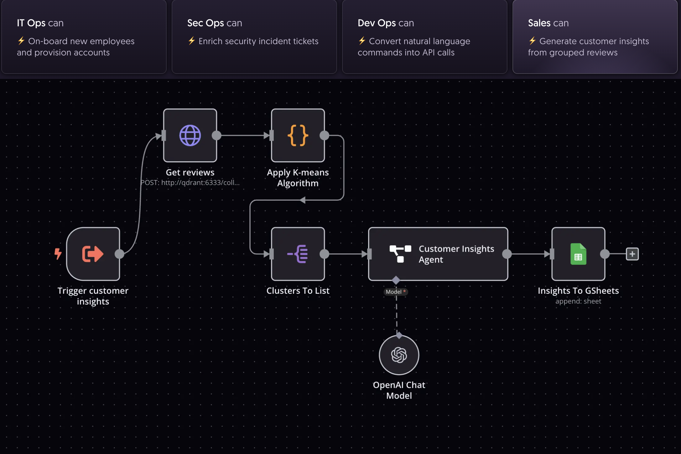 可视化拖拽构建:连接 400+ 应用节点,支持条件分支/错误重试