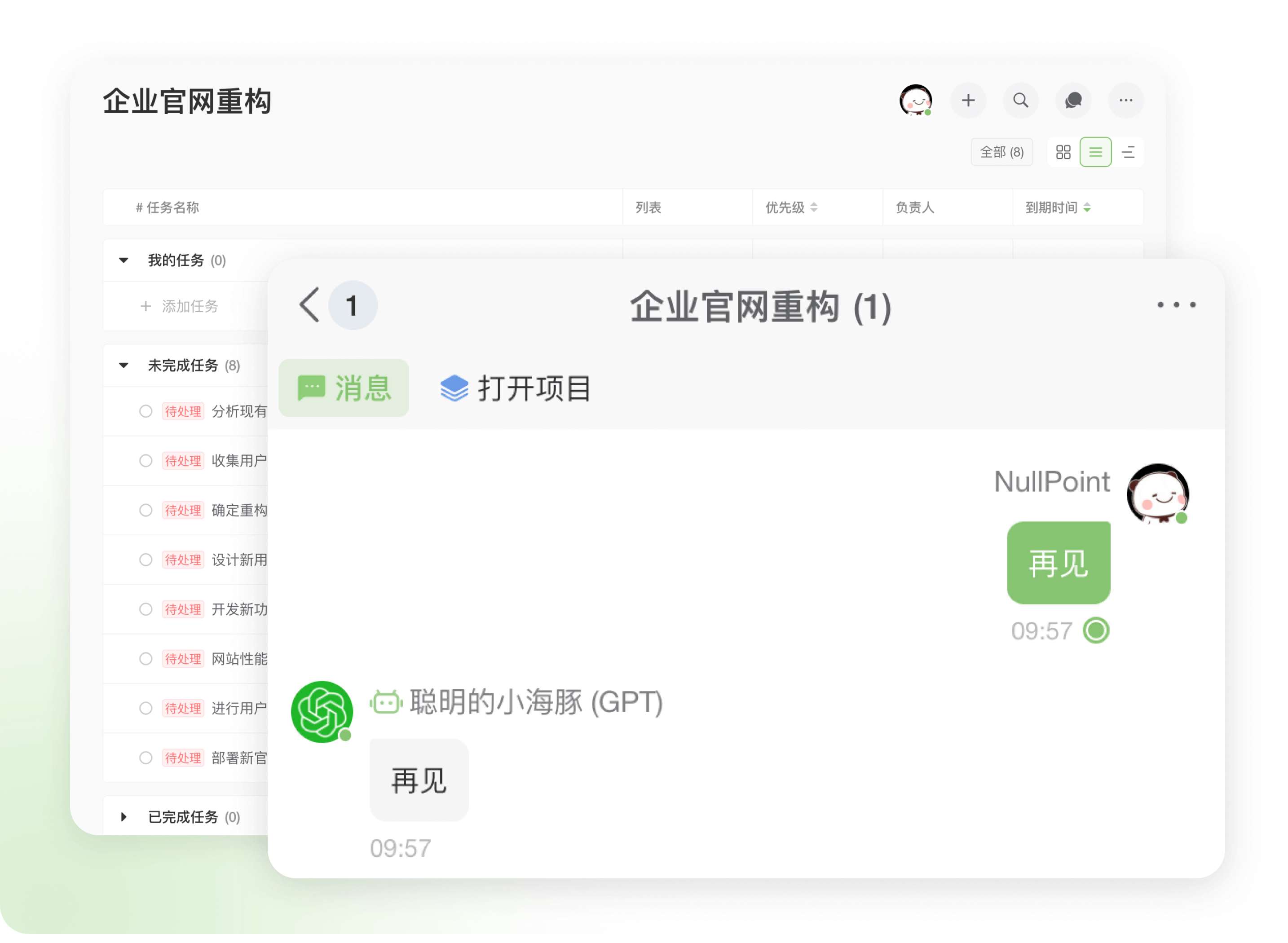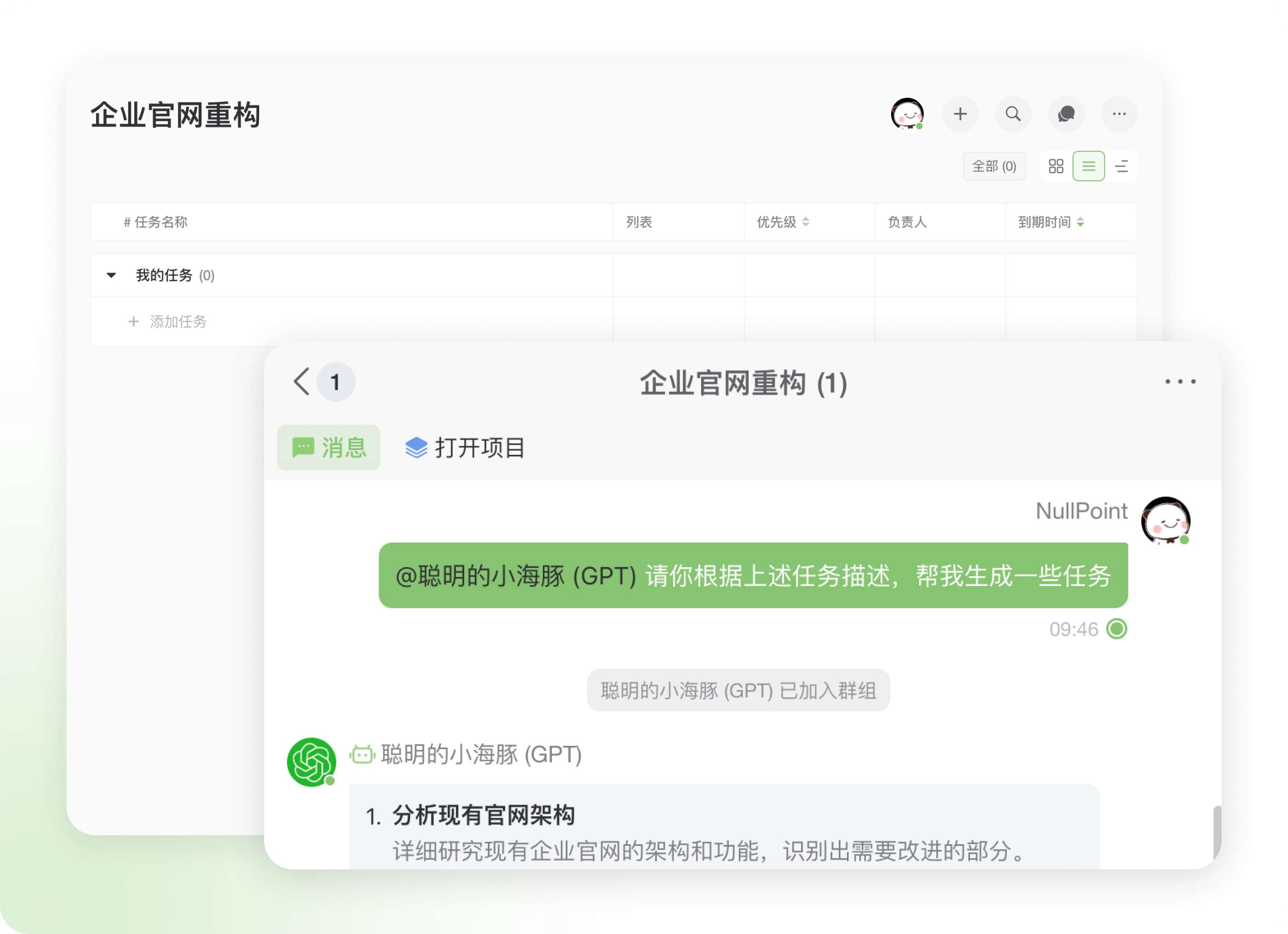 任务/项目内 IM 群组功能,消息可跟随任务上下文传递,实现无痕衔接沟通体验 。