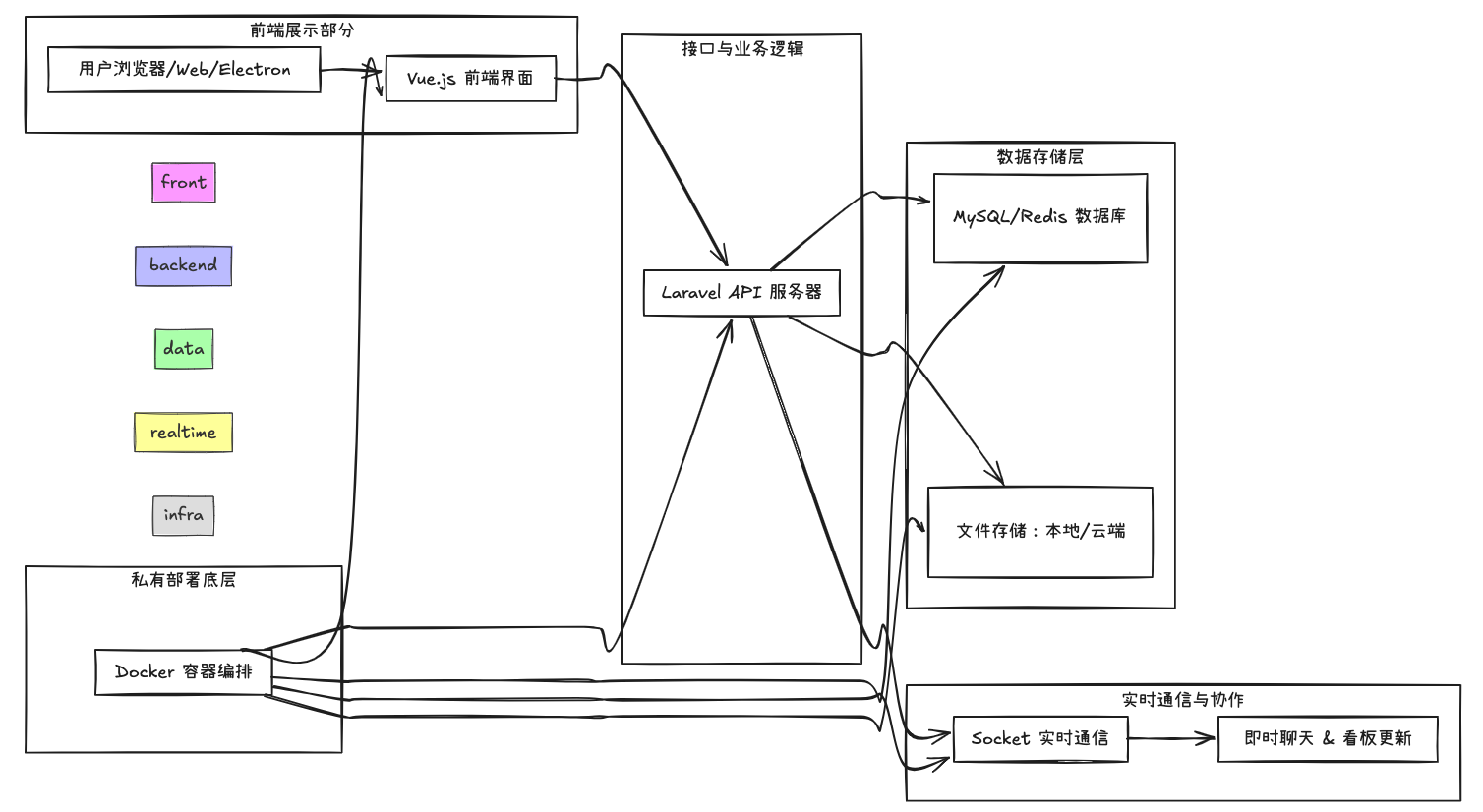 | 前后端分离 | 前端 Vue.js,后端 Laravel,扩展性强,便于插件/自定义开发 |