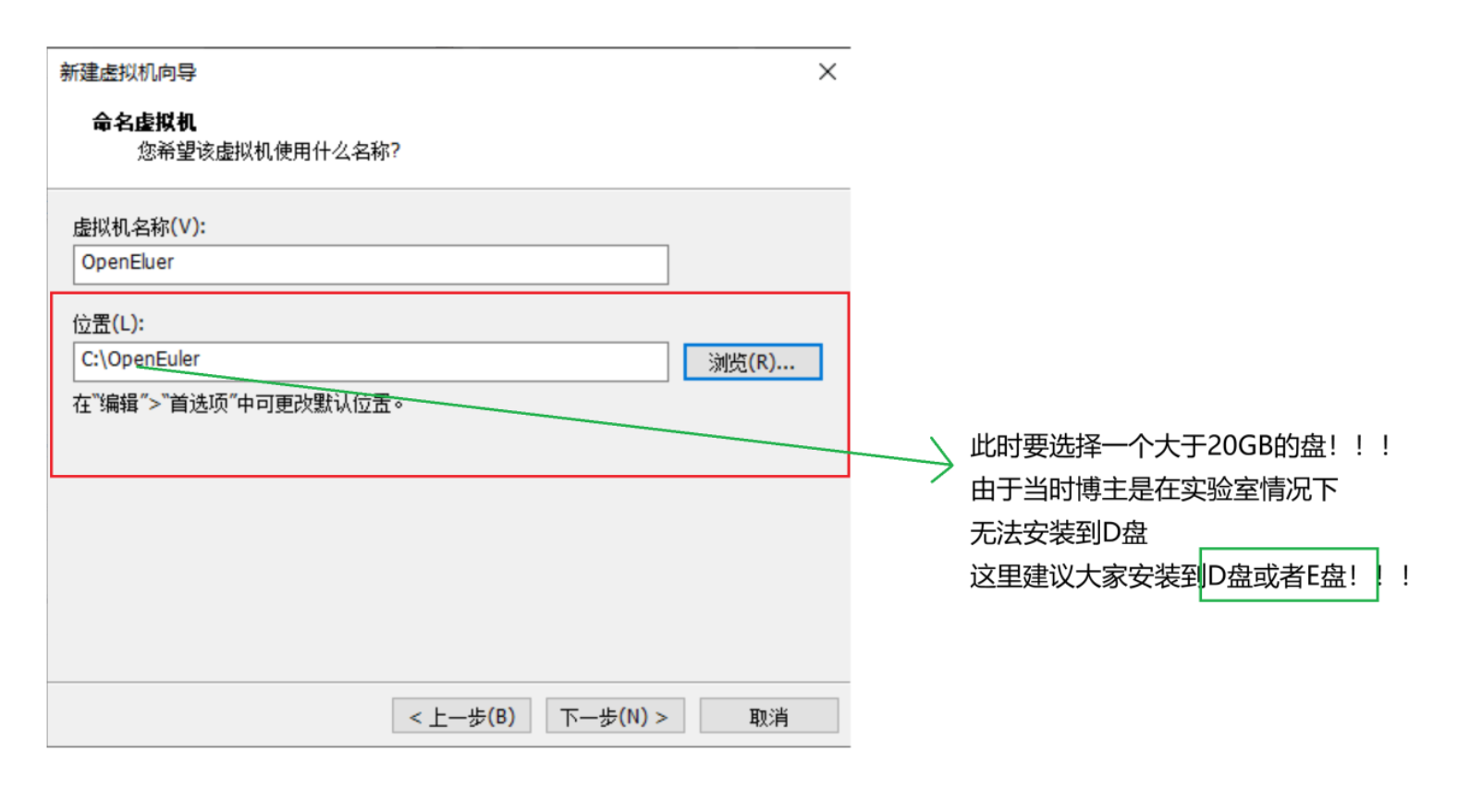 第五步:设置虚拟机名称和安装位置,在选择路径时,需要选择一个内存较大的盘,建议选择D盘,然后单击下一步(此时在D盘中新建一个文件夹,选中你新建的文件夹)