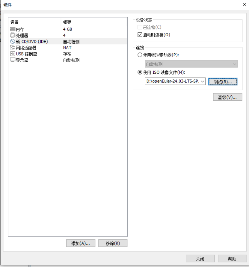 设置虚拟机CD/DVD光驱设备时,如图选择上文下载好的 openEuler-24.03-LTS-x86_64- dvd.iso文件。