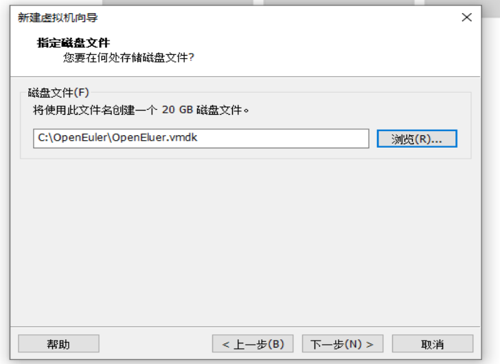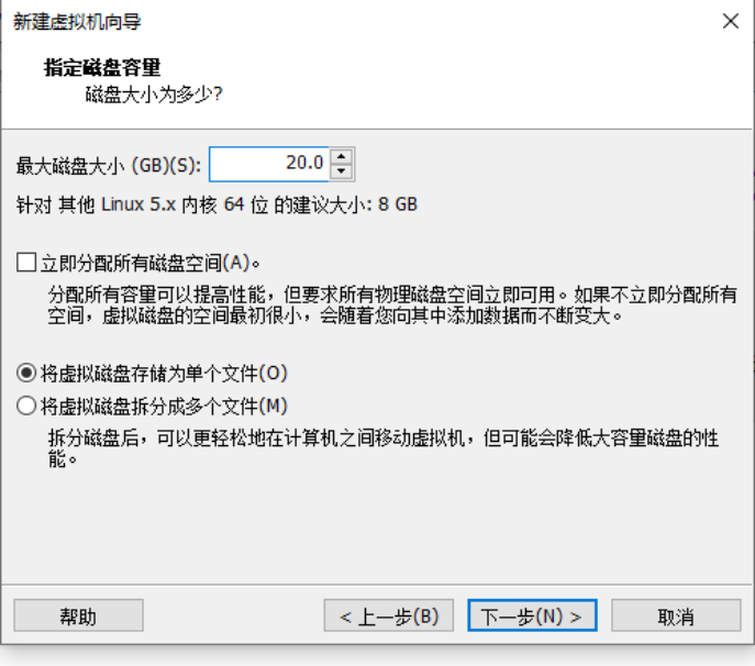 第十二步:指定磁盘容量,最大磁盘大小输入为20GB,选择将虚拟磁盘存储为单个文件,单击下一步