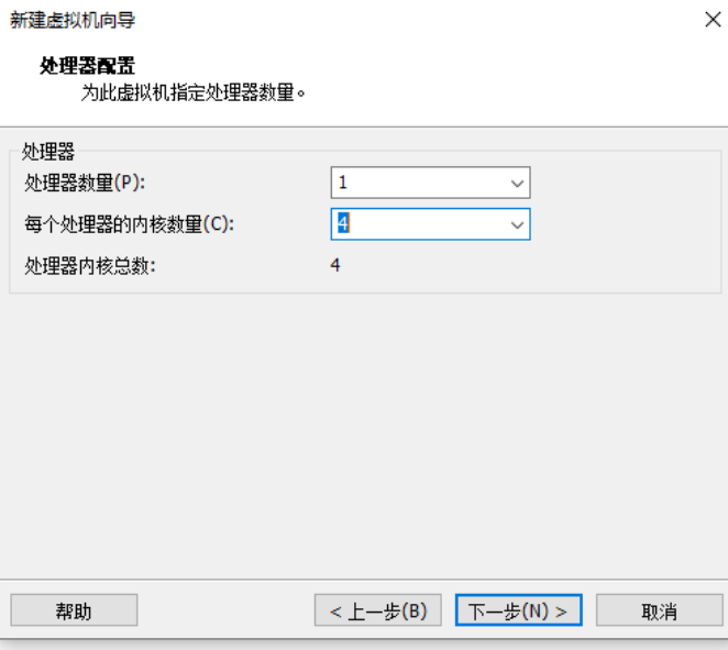 第六步:进入处理器配置页面,选择处理器数量为1;每个处理器的内核数量为4,然后单击下一步