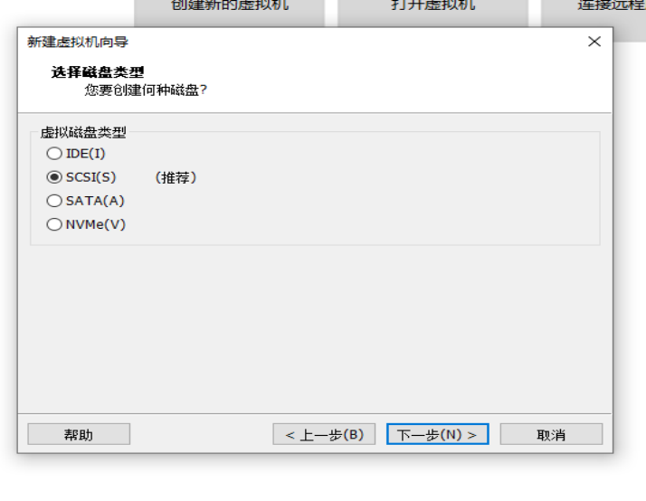 第十步:选择磁盘类型,此时选择SCSI(S)(推荐),单击下一步