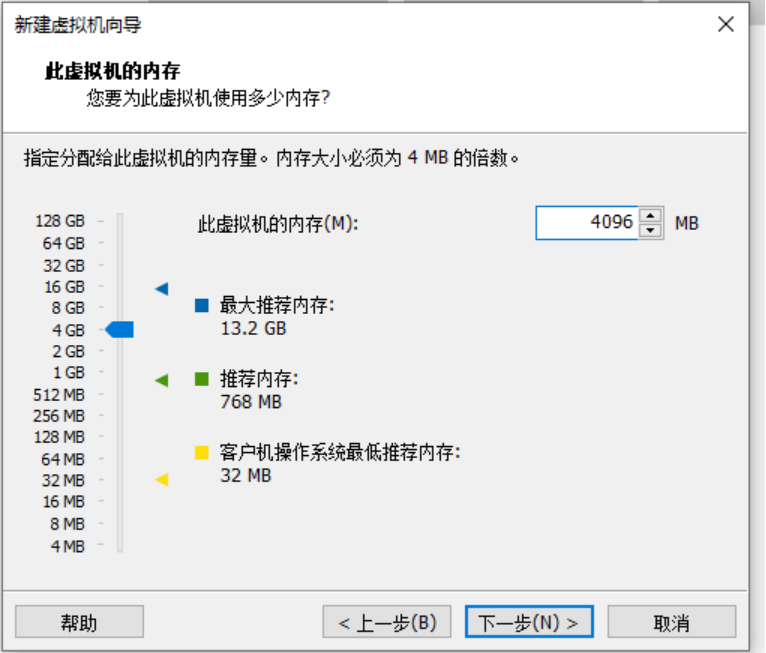 第七步:配置此虚拟机的内存,单机左侧栏的4GB,此时右侧填入处会直接出现4096MB,单击下一步