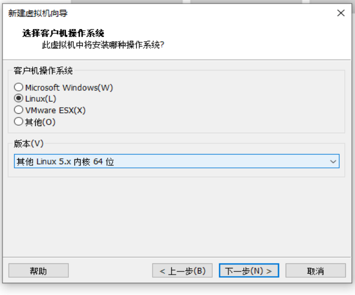 第四步:设置虚拟机的客户机操作系统为Linux,版本可以选择其他 Linux 5.x内核64位,然后单击下一步