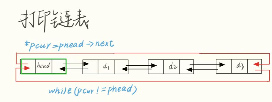 2、通过 while (pcur != phead) 循环遍历链表(只要 pcur 没有回到哨兵位头节点,就继续遍历,因为双向链表是循环的,哨兵位头节点是循环的 “终点” 标志)。