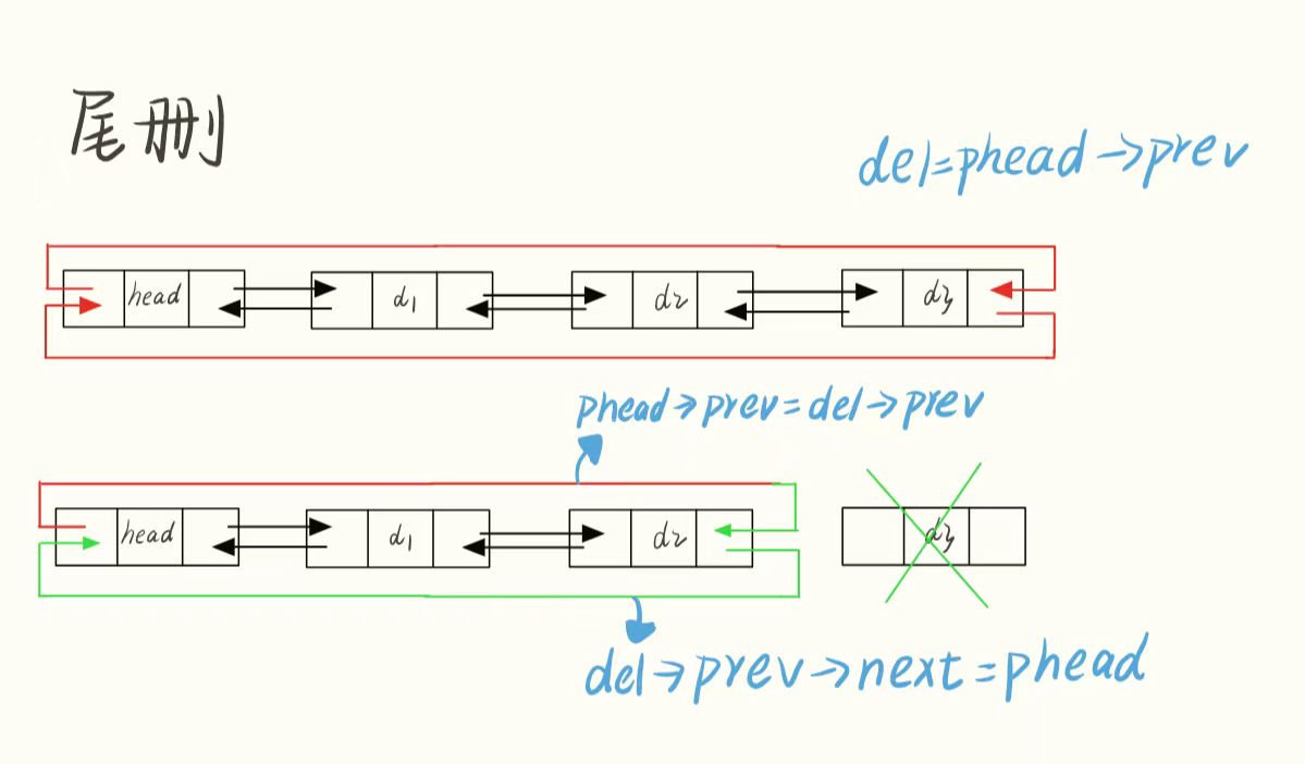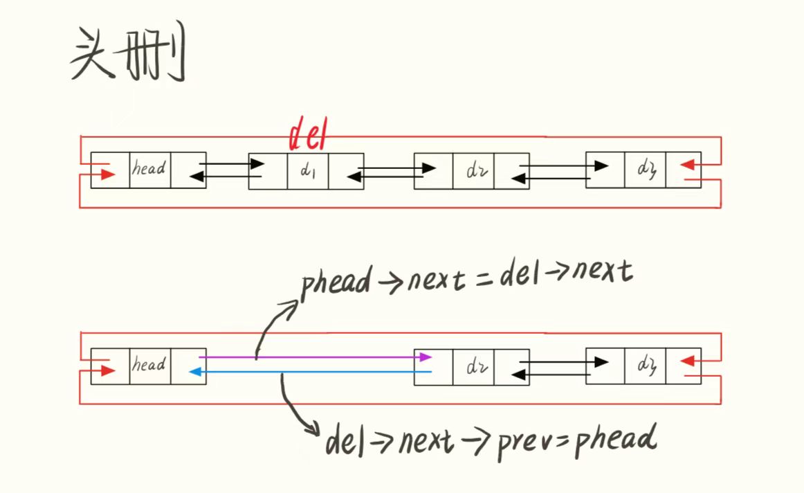 del->prev->next(d2->d3)原本要指向d3现在让它指向phead