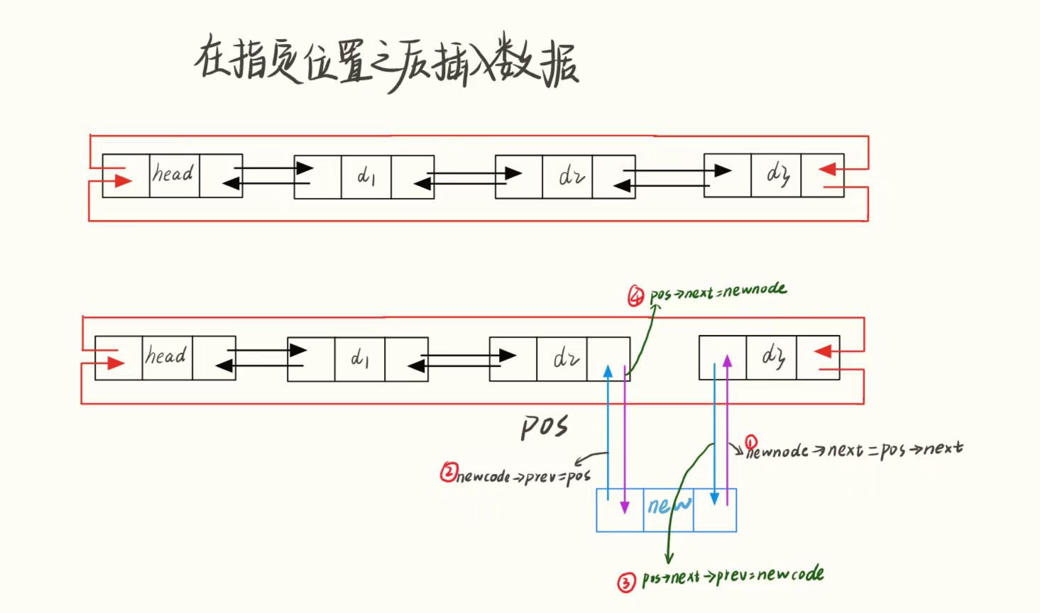 然后让pos节点原本的下一个节点的prev指针指向新节点(pos->next->prev = newnode;)。