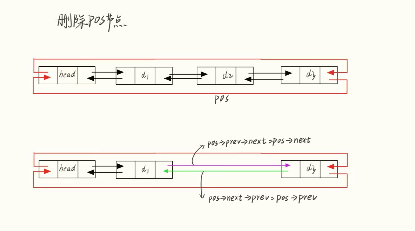 让pos节点的前一个节点的next指针指向pos节点的下一个节点(pos->prev->next = pos->next;)。