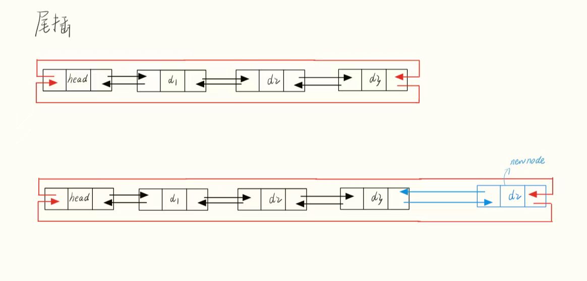 原来的尾节点的next指针指向新节点(phead->prev->next = newnode;)。