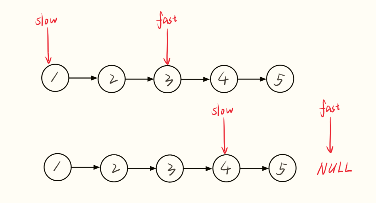 定义两个指针 fast 和 slow,初始时都指向链表的头节点 head。