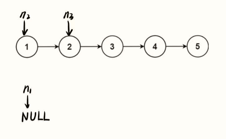n1 指向 NULL(代表 “已完成反转的部分”,初始时还没有反转节点,所以为 NULL)。