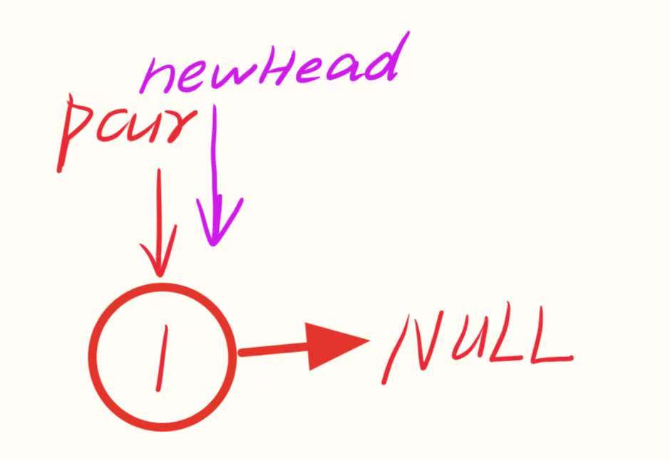 执行 newHead = pcur:新链表的头节点更新为值为 1 的节点(此时新链表为 1→NULL)。
