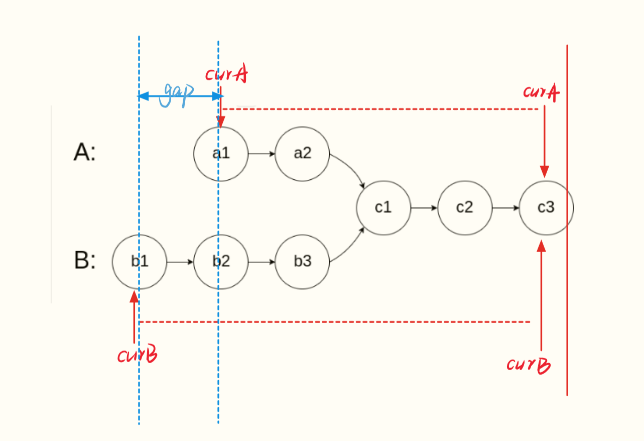 链表A的指针 curA 和链表B的指针 curB 分别遍历各自链表后,通过计算得到长度差 gap 。