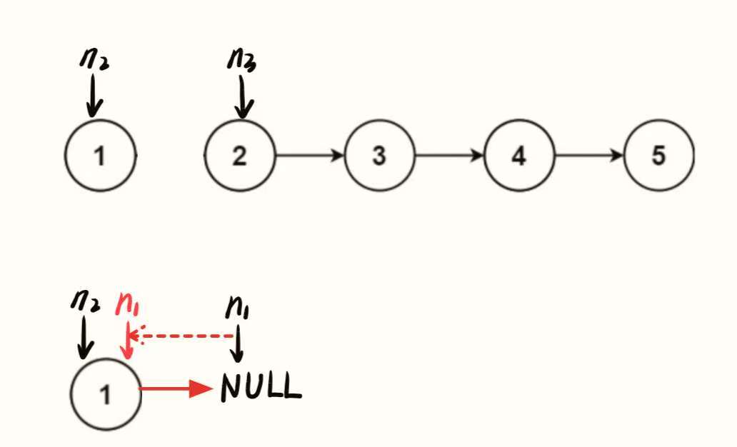 n2->next = n1:将当前 n2 指向的节点(值为 1 的节点)的 next 指向 n1(此时 n1 是 NULL),相当于把 “值为 1 的节点” 从原链表断开,并作为已反转部分的第一个节点(尾节点,因为 next 是 NULL)。
