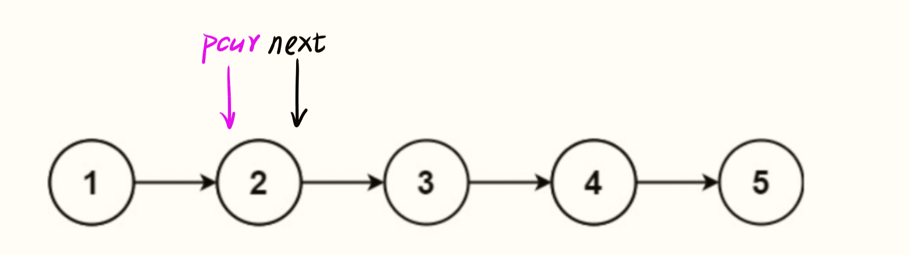 pcur 此时还未移动(代码中下一步才会执行 pcur = next),所以仍然指向值为 1 的节点(但后续会移动到 next 暂存的 “值为 2 的节点”)。