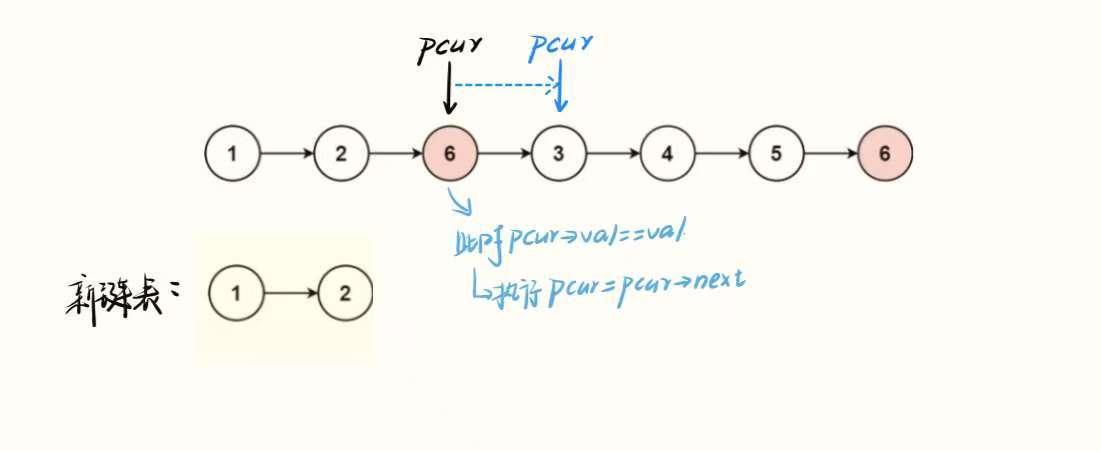 pcur = pcur->next:因为该节点值等于 val,所以不将其插入新链表,直接让 pcur 后移,处理原链表的下一个节点(值为 3 的节点)。