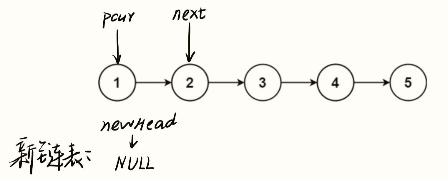 原链表:节点依次为 1→2→3→4→5,pcur 指向原链表的头节点(值为 1),next 暂存 pcur 的下一个节点(值为 2)。
