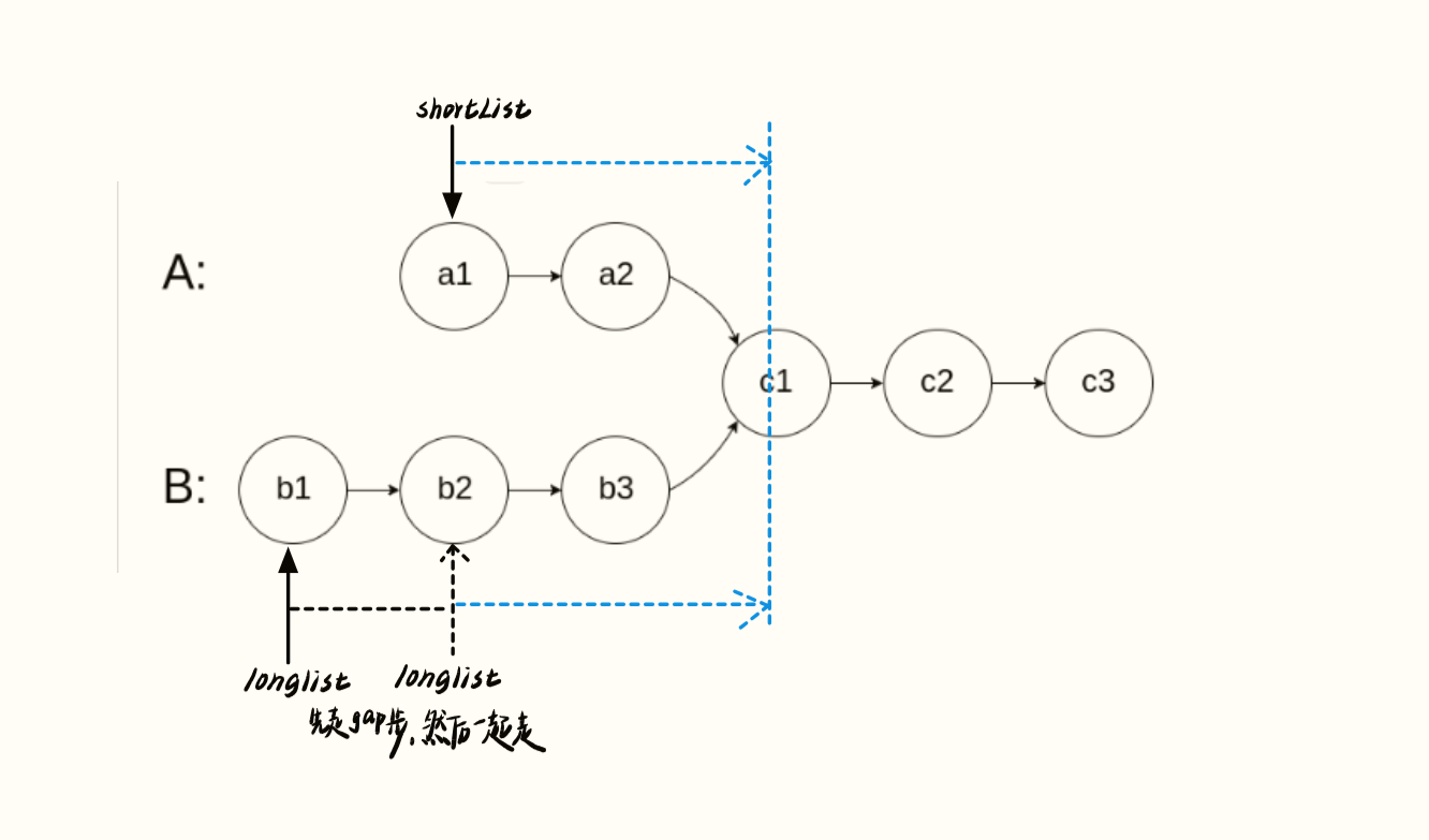之后两个指针( shortList 和 longlist )同步移动,最终会在相交节点 c1 处相遇,以此找到两个链表的相交节点。
