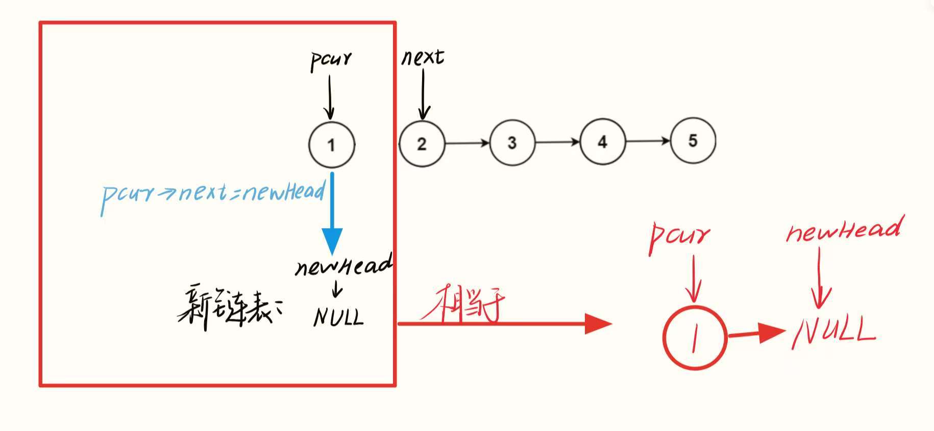 执行 pcur->next = newHead:原链表中值为 1 的节点(pcur 指向的节点)的 next,从 “指向值为 2 的节点” 变为 “指向 newHead(即 NULL)”。