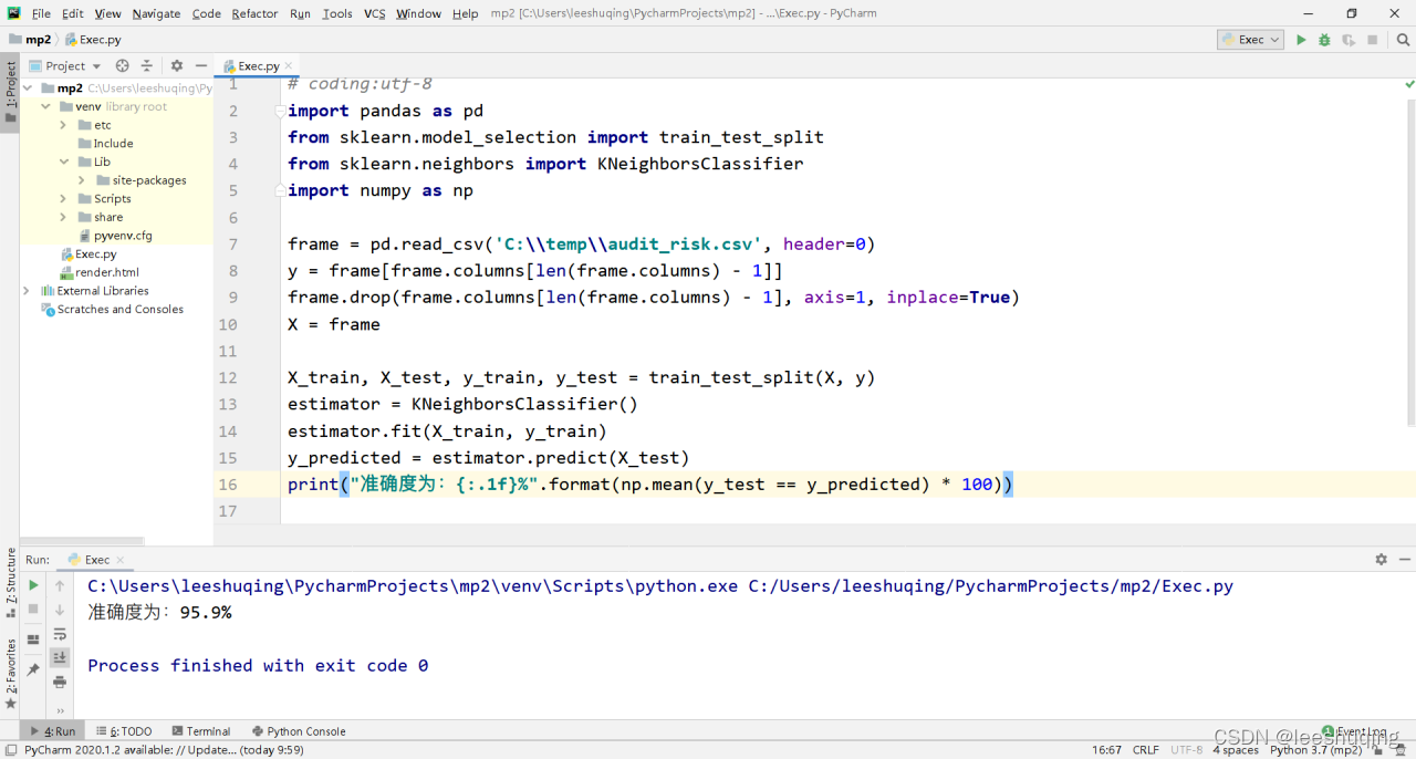 再如Python非常适合处理数据和分析数据。比如这段代码只有十几行,也没有复杂的逻辑,但是却能够实现对企业是否存在信用欺诈进行判断,准确率高达96%。这是不是很有用呢?