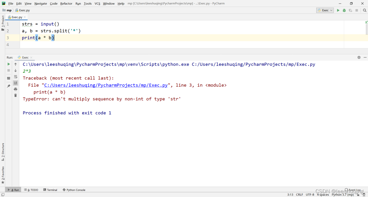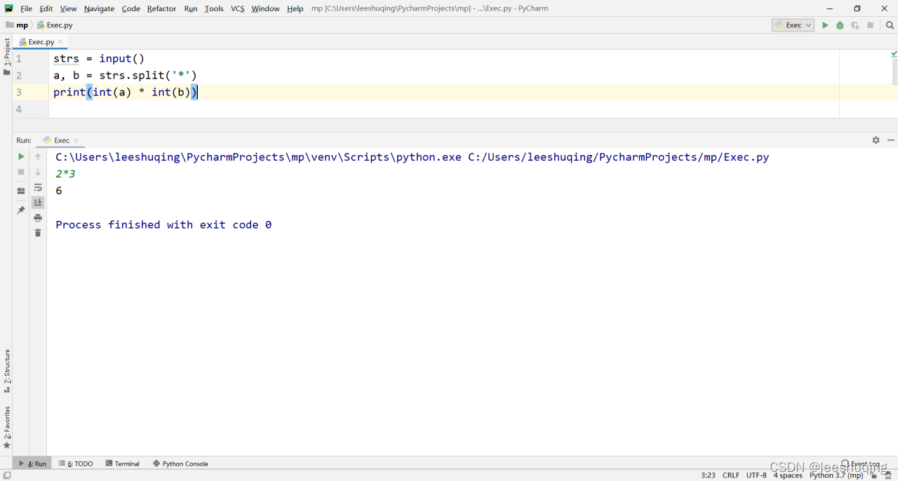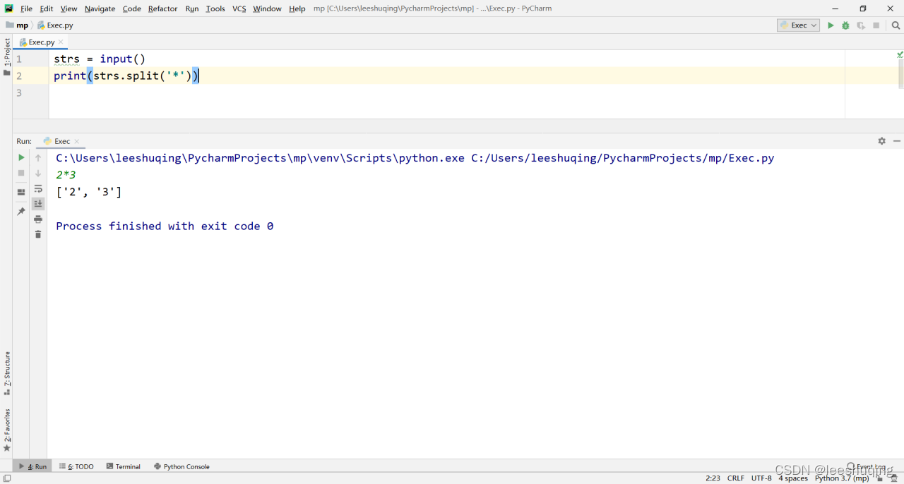 假设我们输入的是“2*3”,那么现在首先就需要将星号前后的两个数值拆分出来。这个可以利用字符串自带的split函数来实现: