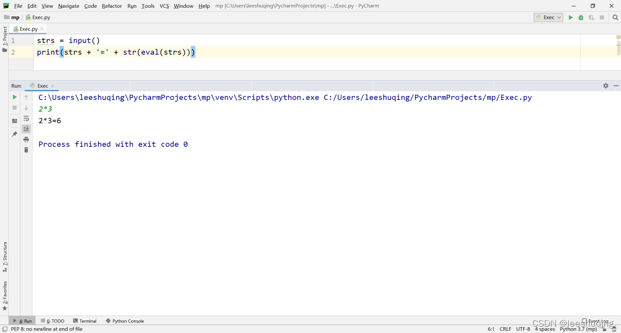 如何理解呢?eval函数可以对参数字符串进行直接替换,并嵌入在当前代码中。比如如果输入“2*3”,则eval(strs)就是2*3,此时它的内容中前后并没有引号,因此上述最后一行语句