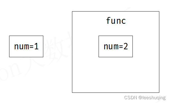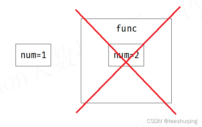 5)函数结束运行后,所有函数内部的变量都会被销毁。因此,那个数值为2的形参num已经不复存在,退一步说,即使存在,在函数func外部,也无法访问函数内部的变量。