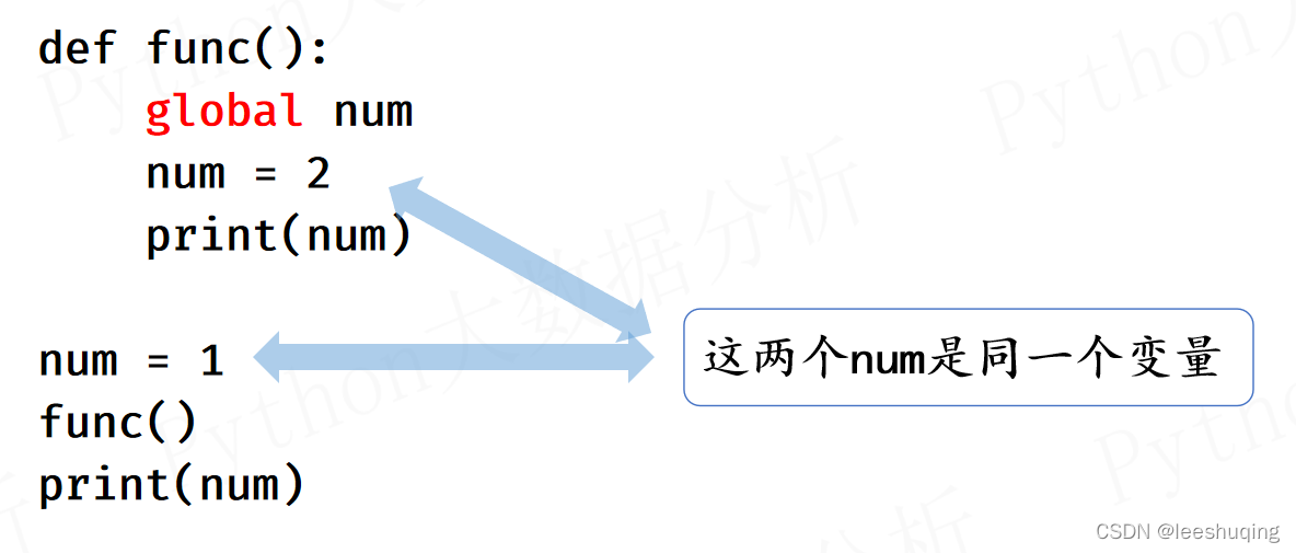 显然函数外面的num被函数改变了。此时该如何理解呢?其实也很简单,那就是在func中的num前面有个global语句声明,这就说明这个num不是自己的num,而是全局的num,global就是全局的意思。所谓全局就是整个代码区域,所以此时它会自动去在全局范围内去寻找num变量,找到后就直接使用这个变量,既可以读,也可以写,所以func函数才能改变外部的num变量数值。