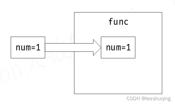 3)开始调用func函数,这个过程涉及到两个变量,一个是写在调用函数括号内的num,用于将数值传递给函数内部的参数,这个变量是实参;第二个是定义在函数里的参数num,用于接收传递过来的数值,这个变量是形参。虽然此时实参和形参两个变量名称一样,但是并不是一个变量;