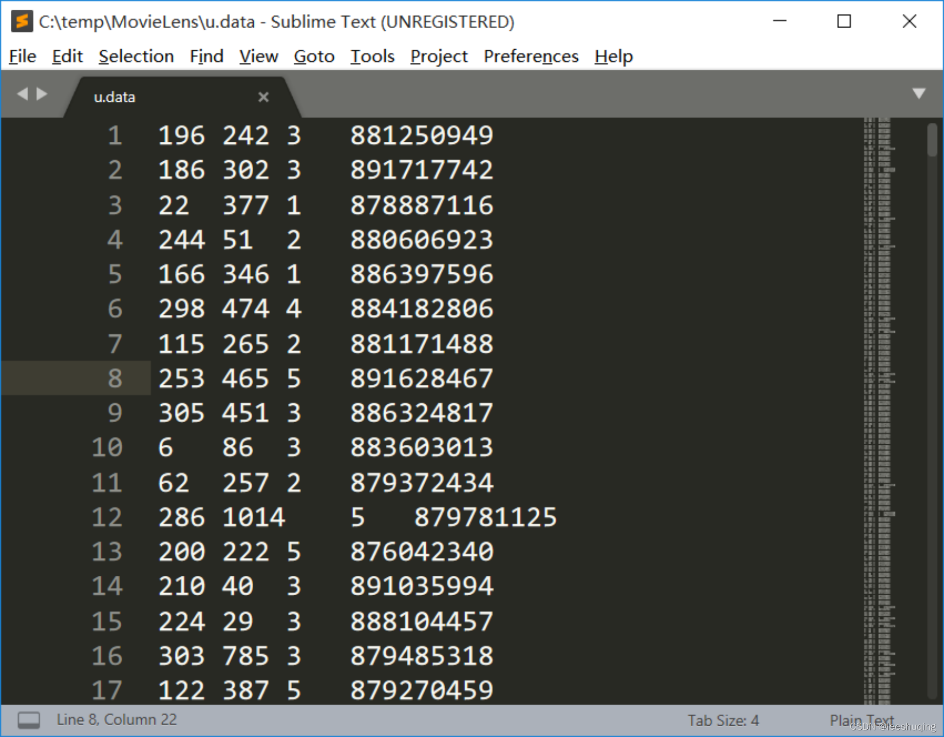 比如对于这个数据文件(下面练习会使用),存储的是用户对电影的评分信息: