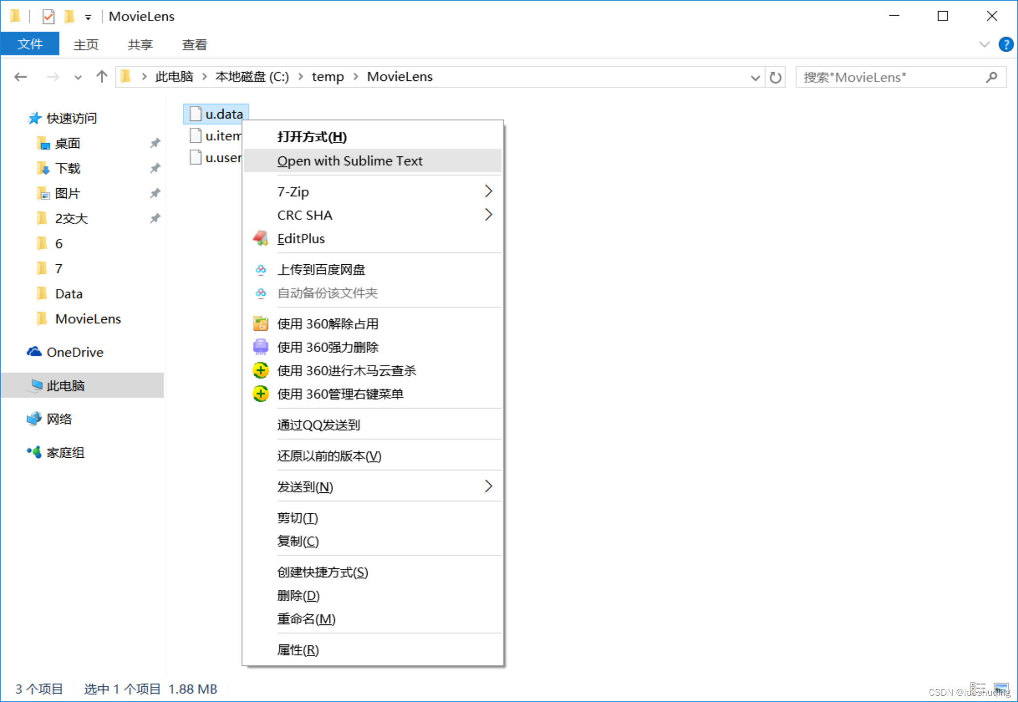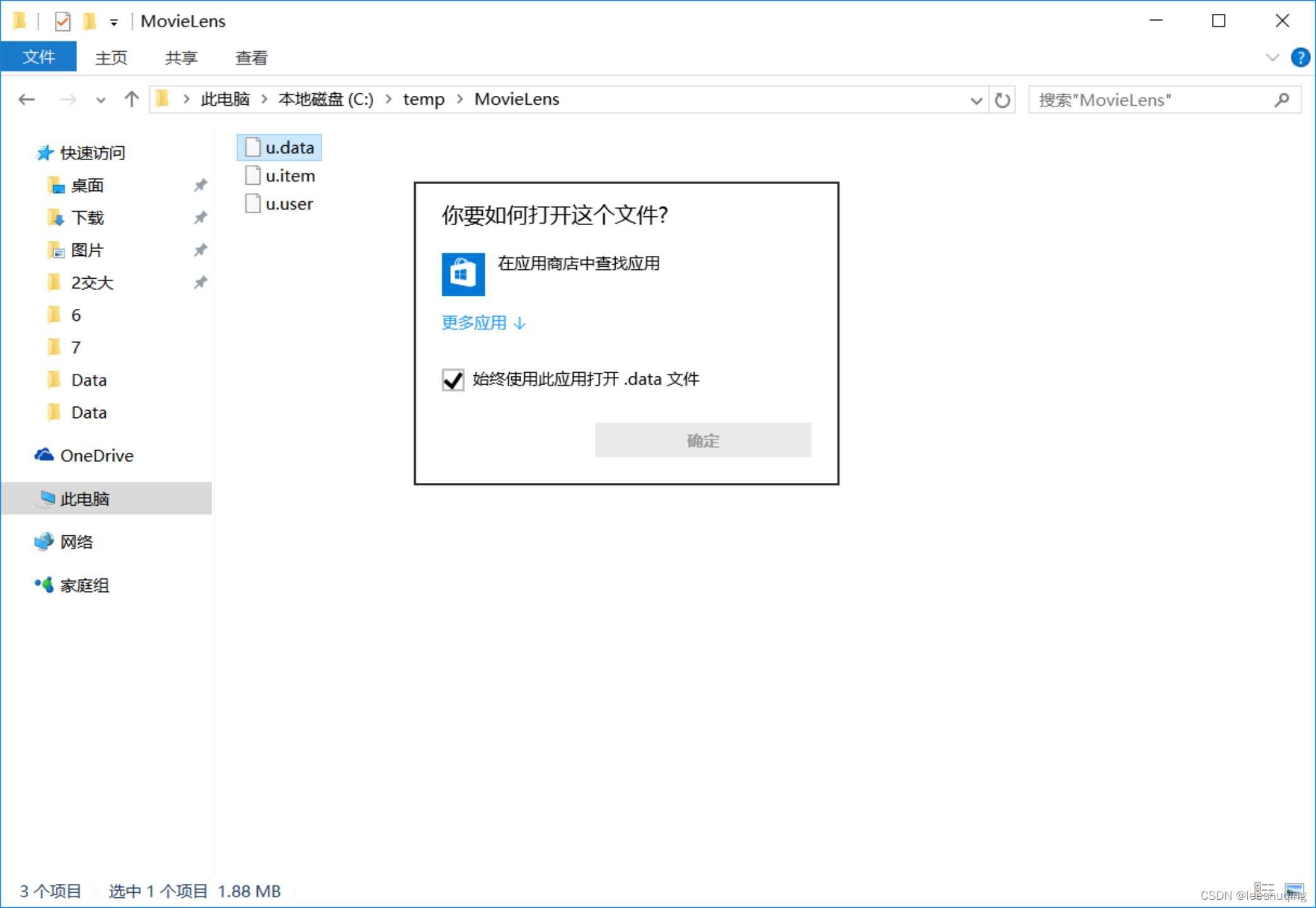 为方便处理,现将该数据文件 u.data 放在 C 盘的 temp 目录下。打开文件的代码为: