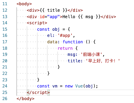 最终发现 title 这个值 “早上好,打卡!” 并没有被渲染到 HTML 上,这是因为 title 所在的 div 并没有在 Vue 实例的作用范围内,也就是说 Vue 实例只能作用到创建实例时所在的模板(比如通过 el 指向的 模板):