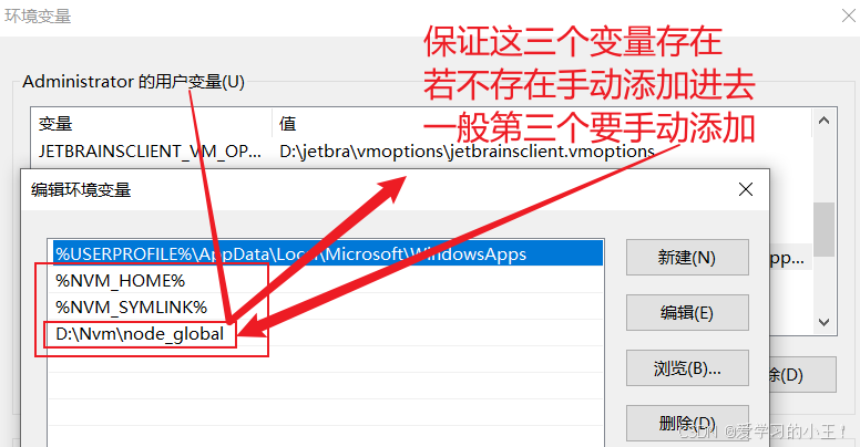 注意:【用户变量】中的path变量,%NVM_HOME% 和 %NVM_SYMLINK% 理论上是nvm安装成功后自动生成的。> 如果有C:UsershuaAppDataRoaming npm,则将其修改为D:\NVM\node_global,如果没有就自己新建D:\NVM\node_global,总之保证有以上内容。