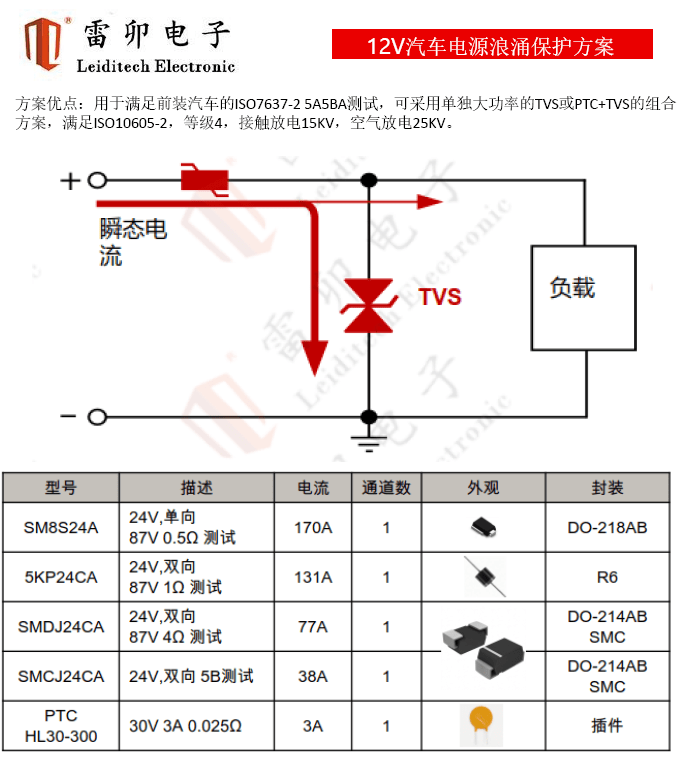 PTC可有效用于电源保护,如汽车抛负载7637-P5A,使用一颗PTC及小功率TVS便可过4Ω 350ms,可根据使用环境、标准替换PTC和TVS
