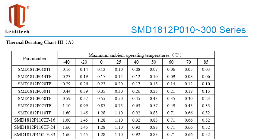 有些工程师对PTC不太了解,往往不能准确的选择适合自己电路的型号,以至于无法起到想要的效果,这里用雷卯SMD1812系列规格书举例,做个简单的选型介绍
