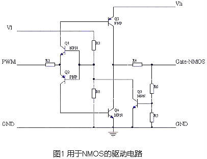在这三种状况下,图腾柱构造无法满足输出请求,而很多现成的MOS驱动IC,似乎也没有包含Vgate限制的构造。于是设计了一个相对通用的电路来满足这三种需求。用于NMOS的驱动电路如下所示: