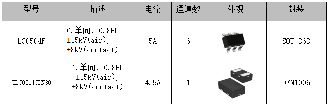 方案优点:USB2.0提供500Mbps的传输速度,本方案采用单颗器件防护,节约空间, 保证信号完整性,满足IEC61000-4-2,等级4,接触放电20kV,空气放电20kV