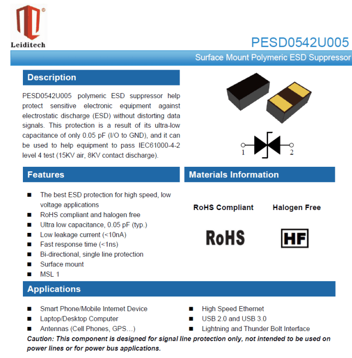 根据信号电压不同,雷卯电子提供5V 12V 24V等不同等级的ESD器件,PESD0542U005/PESD1242U005/PESD2442U005供设计选择。