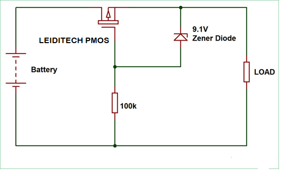 该保护电路比其他保护电路更有效。让我们分析一下当电池以正确的方式连接时,P沟道MOSFET将导通,因为栅极和源极之间的电压为负。查找栅极和源极之间电压的公式为: